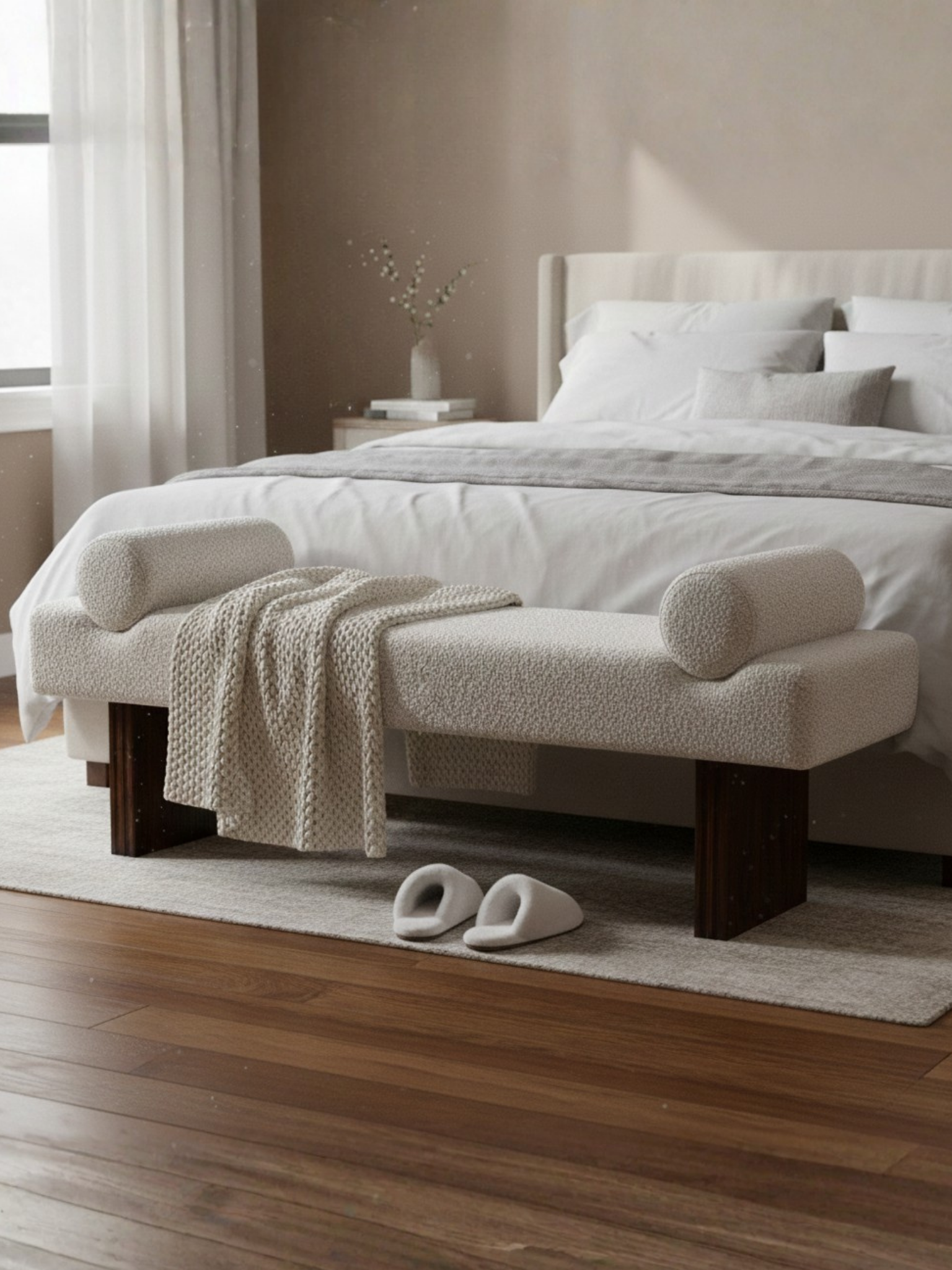 Geometrinin en yumuşak haliyle tanışın. Milano Bench, keskin gövde yapısını uçlardaki dairesel formlarla kırarak yatak odanızda alışılmışın dışında bir siluet yaratıyor. Beyazın netliği ve koyu ahşabın kontrastı, mekanınıza mimari bir derinlik katıyor.